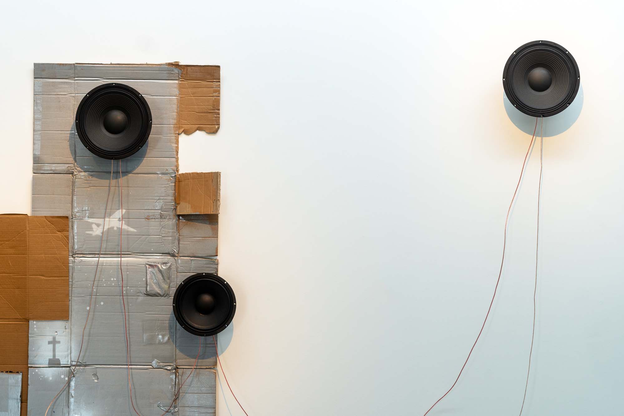 It acknowledges a DIY aesthetic: Takle mines once popular records that have become outdated and obsolete, Urbahn samples and re-mixes songs to bring a raw, occasionally nerve-wracking soundscape to the installations, and Reddaway’s objects are formless bodies made from recycled materials built around audio components.