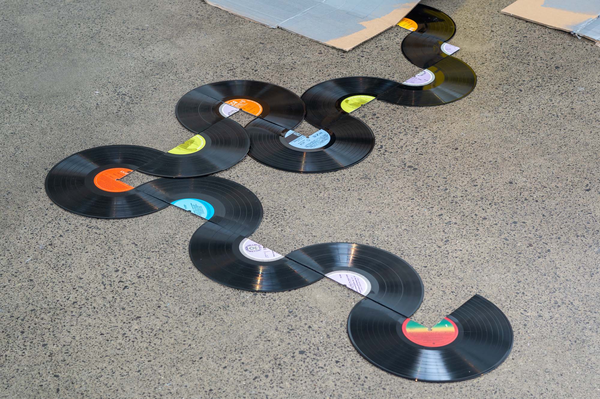 A new collaboration with Terry Urbahn and Grant Takle that mixes found-object constructions and painted vinyl records saturated in mutated sounds and images.