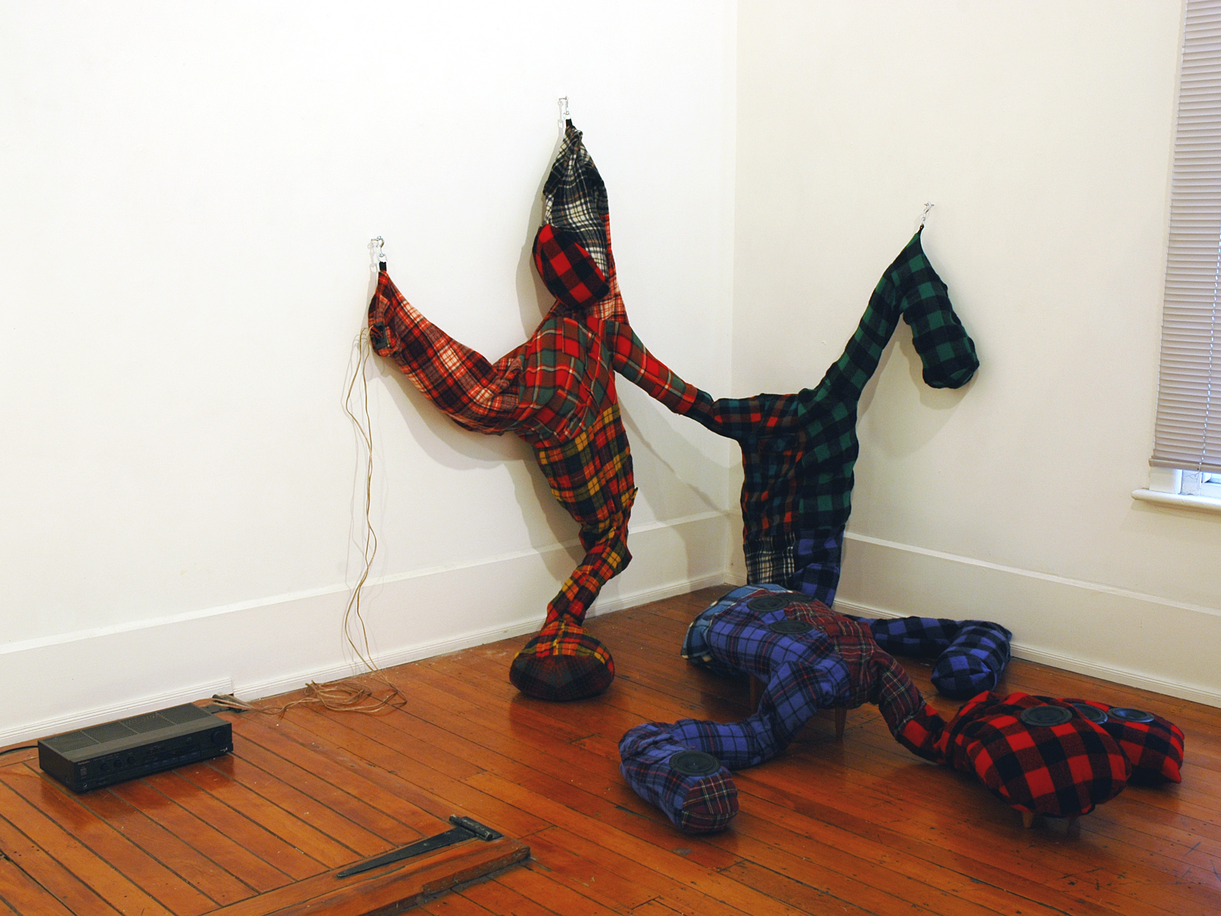 “The highlight though is really Reddaway’s collection of Swandri droopy blob creatures. Part club-footed people, part tartan-clad amphibians, but also woolly and podgy, they cling to the walls and slither downward in crumpled heaps – yet they are actually held off the floor by very low tables. They have a Rob McLeod or Elizabeth Murray look about them, and have speakers built in that for this show are not working. As lumberjack androids they are wonderfully ambiguous in their activity. As if there is some kind of orgy or beating on the floor of the wood shed we have just interrupted.”